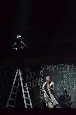 The Azerbaijani performance featured Dihaj dressed in a gold silk overcoat and bodice as well as black pants performing with a male dancer wearing a black suit with a horse head and four backing vocalists. The performance began with Dihaj chalk scrawling words in the corner of a black three-sided box with blackboard walls, while the dancer appeared on a stepladder. After Dihaj climbed the ladder, the backing vocalists dropped the left and right walls of the box with their backs chalk crossed outs by Dihaj. The LED screens transitioned from a red background to a city skyline.[13][14][15] In regards to the performance, which was directed by Naila Mammadzada, Dihaj stated: "The box signed with various words depicts my inner world, while the guy with a horse mask sitting on the ladder impersonates a bad boy. The ladder and the mask imply a huge emotional distance between us." Dihaj and the dancer left the box at the end, which symbolised getting over a self-destructive relationship and deciding to put an end to it.[16][17] The four backing vocalists that joined Dihaj on stage were Jennie Jahns, Johan D. Seil, Kristian Tåje and Marie Nordmark Sjöström, while the dancer was Vitaliy Zagoruiko.[18]