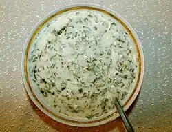 | Dogramaj | A cold soup based on a yogurt–water mixture (Ayran) poured over sliced cucumbers and greens (dill, coriander, basil, tarragon, and sometimes mint).[16] |