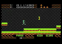 The original version of the game on the Atari 8-bit computers presented itself as a side-scroller, with the player's character running continuously from left to right as the background and path continuously scrolled. Control was limited to jumping at three different heights; holding the joystick down and pressing the button resulted in a low jump, holding the joystick up and pressing the button resulted in a high jump, and pressing the button by itself resulted in a medium jump. The running speed of the character was constant; only the height of the jumps differed, although speed of the character gradually increased of its own accord with each passing level. In two-player mode, each player controlled a different colored character with one character running in front of the other. The object of the game was to cover as much distance as possible without succumbing to the assorted perils of the path. Obstacles included platforms and ceilings of differing heights, pits, spikes, platform steps of staggered heights, and other assorted pitfalls. Contact with any part of the landscape other than the path would result in the loss of a player's life and would return the player to the last checkpoint.