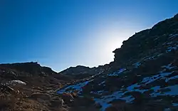 Another lava channel reaches west from Búrfell in direction of Kaldársel, but as it is filled up with lava, it is not easily found as a landscape feature.[8] This is the oldest lava channel, it is named Lambagjá ([ˈlampaˌcauː], "lamb canyon"), the youngest is Kringlóttagjá ([ˈkʰriŋlˌouhtaˌcauː], "round canyon") south of Búrfellsgjá,[6] where there was also a lava pond.[3]