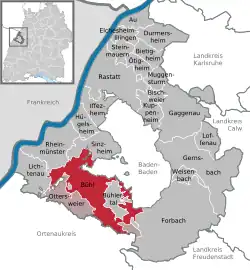 Bühl is a town in the southwestern state of Baden-Württemberg, Germany, about 10 km (6.2 mi) South of Baden-Baden. Bühl is the third largest town in Rastatt County (Landkreis), after Rastatt itself and Gaggenau. Due to its location, size and importance it has become a central place for numerous towns, townships and villages in the neighbourhood. Bühl was proclaimed a major district town (Große Kreisstadt) on 1 January 1973, after it lost its status as an independent county seat during municipal reforms in Baden-Württemberg. The following villages form the district town of Bühl: Altschweier, Balzhofen, Eisental, Kappelwindeck, Oberbruch, Oberweier, Moos, Neusatz, Rittersbach, Vimbuch, Weitenung. Bühl forms a joint administrative community with the municipality of Ottersweier.
