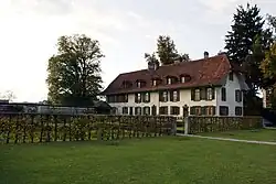 The reformed church of Bümpliz, formerly a Roman Catholic church dedicated to St. Maurice, was rebuilt in 1666 after a fire by Abraham Dünz. It received extensions by Karl Indermühle in 1915 and 1924 as well as by Karl Indermühle in 1952.[8] Also in Bümpliz, the Feller country estate, a 1730 construction, was reshaped in the Classicist style in the 19th century, and is now embedded in the Fellergut highrise housing development.[11] In Brünnen, the former lord's estate, a 1648 construction with 1765 extension by Niklaus Sprüngli, features painted wood carvings that are among Bern's best architectural sculptures from the Louis XV period.[12]