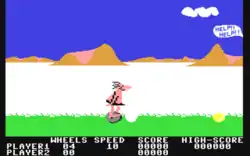 B.C.'s Quest for Tires is a horizontally scrolling video game designed by Rick Banks and Michael Bate and published by Sierra On-Line in 1983.[1] Versions were released for the Commodore 64, IBM PC, Atari 8-bit computers, ColecoVision, ZX Spectrum, MSX, and Apple II. Based on the comic strip B.C. by Johnny Hart, BC's Quest for Tires is similar to Irem's Moon Patrol from the previous year.[2] A wheel-riding caveman is always moving forward through horizontally scrolling levels, and the player jumps or ducks as obstacles approach. The game's title is a play on the contemporaneous film Quest for Fire.