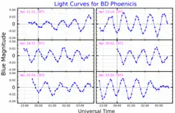 BD Phoenicis is a Lambda Boötis star, an uncommon type of peculiar stars that have very low abundances of iron-peak elements. In particular, BD Phoenicis has near-solar carbon and oxygen content, but its iron abundance is only 4% of the solar value.[1] BD Phoenicis is also a pulsating variable of Delta Scuti type, varying its apparent magnitude between 5.90 and 5.94.[3] A study of its light curve detected seven pulsation periods that range from 50 to 84 minutes, the strongest one having a period of 57 minutes and an amplitude of 9 milli-magnitudes. Pulsations are common among Lambda Boötis stars and seem to be more common than normal main sequence stars of the same spectral type.[1]