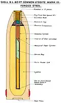 Shell60 lb (27 kg) shell with 8 pounds (3.6 kg) Lyddite or 6 pounds (2.7 kg) Amatol.[a]