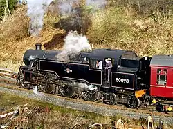 Of the fifteen engines to survive into preservation, only one was purchased directly from BR and this was No. 80002, all the others being purchased from Barry Scrapyard. Of the fifteen engines to be preserved only two members of the class are yet to run in preservation, these being: 80100 and 80150. 80097 has recently been steamed in preservation and entered service in March 2019 following its restoration from scrapyard condition at the East Lancashire Railway.[8] Five of them have also seen mainline operation: Nos. 80002, 80079, 80080, 80098 and 80135. 80002 operated over the former BR system in the 1970s when it appeared at an open weekend in Leeds arriving and returning home from the event under its own power. Three of the class were regular mainline performers around the '90s, with 80080 being originally used on LU 'Steam on the Met' trips. In 1991, steam was to return to the Folkestone Harbour branch with 80080 taking the train down from the mainline to the station at Folkestone Harbour and then for the journey back up to the mainline 80080 was used to bank West Country Pacific No. 34027 Taw Valley.