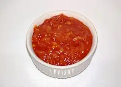 The accompanying sauce for the Dutch version is similar to other tomato-based sweet and sour sauces common in Cantonese cuisine.[8] Most recipes for this sauce include tomato puree, ketchup or fresh tomatoes, fresh or powdered ginger, water, vinegar, salt and a large amount of sugar. Recipes may also include onion, garlic, soy sauce, sambal, fresh chili peppers, sherry or rice wine, broth, MSG, and cornstarch for thickening.