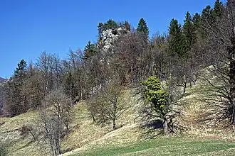 Valvasor's 1689 The Glory of the Duchy of Carniola states that an "old, destroyed, mighty camp" stood at the top of Veternik Hill and that it was a "large structure, containing fourteen rooms."[8] This fortification, the Babčar Fort (Babčarjev tabor), is named after the Babčar farm in the village and dates back to at least the 15th century.[11] The ruins of the Babčar Fort are protected as cultural heritage.[14]