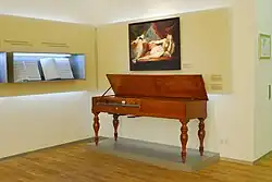 Since 1973, five baroque keyboard instruments are demonstrated in a music performance every hour.[52] These include two chamber organs (Switzerland, ca. 1750,[53] and Thuringia, ca. 1650), a fretted clavichord (around 1770),[54] and a spinet built 1765 in Strasbourg by Johann Heinrich Silbermann, a nephew of Gottfried Silbermann whose instruments Bach helped sell in Leipzig.[55] The Thuringian positive organ's history and Bach's biography overlap: from 1714 on, it served as a church organ in Kleinschwabhausen, about 15 km from Weimar where Bach was court organist at the time. Bach's protégée and family friend, the court organ maker Heinrich Nicolaus Trebs, repaired the organ in 1724 and 1740, and Johann Caspar Vogler, Bach's student and successor as court organist, tested the organ in 1738, 1740 and 1744. Since inspecting the dukedom's organs belonged to the court organist's duties, the museum conjectures that Bach must have known and played this instrument, even though there is no record of it.[56]