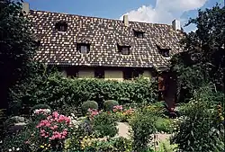 The historical Bach House is one of the oldest residential buildings in Eisenach. It originally consisted of two buildings, of which the eastern part was built in 1456 and the western part in 1458. At around 1611, both were joined.[10] As was normal with the Ackerbürgerhäuser (burghers' houses) of that time, the ground floor was used for agricultural purposes: today's instrument hall may have been used as a barn, and the rooms next to the stairs for cattle and horses.[11] In the museum, a cowbell from 1688 found in the Bach House garden reminds of this past. In the first floor of the building, a Renaissance glass window frame and the timber panelling of the living room now decorated as Composing Studio still bear witness of the citizen status of the house's former occupants. At the time of Bach's birth it was owned by Heinrich Börstelmann, headmaster of the Latin School. In 1746, the family of Caroline Amalie Rausch née Bach moved into the building and lived there until 1779. Caroline Amalie was the daughter of Bach's second cousin and friend Johann Bernhard Bach and sister to Johann Ernst Bach, a student of Bach at Leipzig and then court music director at Eisenach.[12]