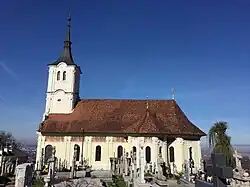The cruciform church sits in a nearly circular yard that serves as a parish cemetery. It is 29.74 meters long, 16.11 meters wide at the side apses and 14 meters high at the roof edge. The spire stretches to 32 meters, with the sound of the bells carrying far below into the valley. From the tower, one can see Brașov, Sfântu Gheorghe and several mountain ranges. The facade is in the contemporary Baroque typical of southern Transylvania. Pairs of Corinthian pilasters divide the facade into vertical registers. Pilasters also decorate the spire.[1]