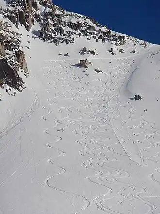 Backcountry skiing (US), also called off-piste (Europe), alpine touring, freeriding or out-of-area, is skiing in the backcountry on unmarked or unpatrolled areas either inside or outside a ski resort's boundaries.[1] This contrasts with alpine skiing, which is typically done on groomed trails benefiting from a ski patrol. Unlike ski touring, backcountry skiing can – and often does – include the use of ski lifts including snowcats and helicopters. Recent improvements in equipment have increased the popularity of the sport.[2] As the sport does confront the individual practicing it with the dangers of natural, unprepared alpine terrain like avalanches, it is generally recommended to carry standard safety equipment and to learn beforehand how to behave safely under such conditions.