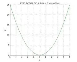 Consider the network on a single training case: . Thus, the input and are 1 and 1 respectively and the correct output, t is 0. Now if the relation is plotted between the network's output y on the horizontal axis and the error E on the vertical axis, the result is a parabola. The minimum of the parabola corresponds to the output y which minimizes the error E. For a single training case, the minimum also touches the horizontal axis, which means the error will be zero and the network can produce an output y that exactly matches the target output t. Therefore, the problem of mapping inputs to outputs can be reduced to an optimization problem of finding a function that will produce the minimal error.