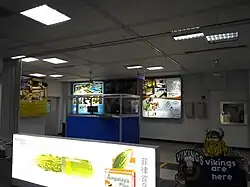 The largest building in the complex is the 6,187-square-meter (66,600 sq ft) main passenger terminal with three levels.[5] The ground floor holds the check-in counters, the public concourse, the arrival area and the information counter. The second floor has the three pre-departure areas with their VIP and CIP lounges; these pre-departure areas lead out to three jet bridges at an apron that can handle up to five aircraft simultaneously. Philippine Airlines also operates a Mabuhay Lounge for the use of its business class passengers on the second floor.[16] Also on the second floor are Merci Pasalubong Shop and Bong-Bong's Pasalubong Shop, occupying the spot of the former Civil Aviation Authority of the Philippines office since it transferred to the Administration Building. On the third floor is the viewing deck with a concession area and rooms for maintenance and airport machinery.[17]
