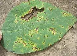 Bacterial blight of soybean is caused by the bacterial agent Pseudomonas syringae pv. glycinea. This bacterium also causes disease in snap bean (Phaseolus vulgaris) and lima bean (Phaseolus lunatus), however it is more commonly seen in soybean.[4] Pseudomonas syringae pv. glycinea attacks all of the above-ground parts of soybean, but symptoms are typically seen on the mid-upper canopy of leaves and pods.[5] After infection, small, water-soaked spots surrounded by a chlorotic halo appear on the leaves. The brown or black centers of these spots indicate that the tissue is dying. Typically these spots will enlarge and merge to form large, dead patches on the leaves.[6] The leaves appear ragged if the dead tissue falls out. Lesions on pods are initially small and water-soaked but eventually enlarge, turn brown to black, and merge to encompass the whole pod.[7] Infection can also occur on the stems, petioles and seeds.[6]