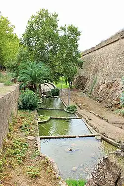 The bastioned enclosure is composed of several defensive buildings such as the curtain wall of the defensive walls, the gates, designed to allow and control the entry and exit of the inhabitants, the bastions consisting of pentagonal constructions, which join two consecutive lines of defensive wall on the inner side of the pentagon, the forts located on the outside of the defensive walls and that were the first line of defense of the population and the ravelins that are triangular fortifications located in front of the body of the main fortification –generally on the other side of a moat– whose objective is to divide an attacking force and to protect the curtain wall of the defensive walls using crossfire. There are also other defensive elements such as moats, foothills, drawbridges, escarpments, and various smaller buildings either attached to or independent from the main enclosure.[10]