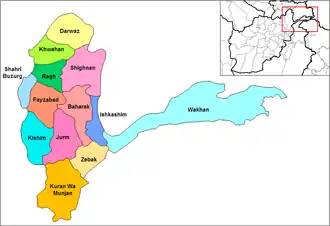 It is part of a broader historical Badakhshan region, parts of which now also lie in Tajikistan and China. The province contains 28 districts, over 1,200 villages and approximately 1,055,000 people.[4][5] Fayzabad serves as the provincial capital. Resistance activity has been reported in the province since the 2021 Taliban takeover of Afghanistan.[6][7]