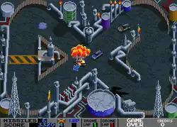 Badlands is a 1990 arcade video game published by Atari Games. It was ported by Domark under the Tengen label to the Amiga, Amstrad CPC, Atari ST, Commodore 64, and ZX Spectrum. The game is a re-themed version of Atari's previous racing games Super Sprint and Championship Sprint with the addition of vehicular combat. Badlands is set in the aftermath of a nuclear war and races around abandoned wastelands with many hazards. Three gun-equipped cars race around a track to win prizes.