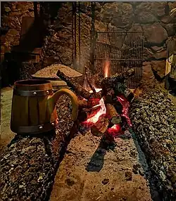 When evening comes, the badnjak log is placed in the hearth. In Dalmatia, as the badnjak is brought into the home, it is sprinkled with wine and grain. In the southern part, women would adorn the logs with leaves and flowers and wrap them around with red and gold ribbons.[6] In Dubrovnik, the father sprinkles corn and wine on the badnjak while reciting prayers. In other regions, the badnjak is sprinkled with wheat and holy water, while in Hercegovina the badnjak is completely bathed in holy water.[7] As the log is lit, the father of the family recites the Apostles' Creed. In southern Dalmatia, two logs are often placed in the shape of a cross. After the log is lit, he says "Jesus be praised. Welcome Christmas Eve." Sometimes, more holy water is sprinkled on the badnjak after it is lit. Depending on the region, people may choose to sprinkle bits of wheat grain, or even add some of the evening meal to the badnjak. In Istria, if wine or rakija is sprinkled on the badnjak, a family member toasts: "Drink to your health" (Pij u tvoje zdravlje) believing if they don't then ill fortune will come to them. The log is usually allowed to burn all night into Christmas Day, and family members often take turns all night ensuring the log does not go out.