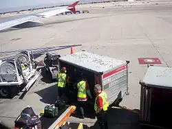 In the airline industry, a baggage handler is a person who loads and unloads baggage (suitcases or luggage), and other cargo (airfreight, mail, counter-to-counter packages) for transport via aircraft. With most airlines, the formal job title is "fleet service agent/clerk", though the position is commonly known amongst airline employees as a "ramp agent", due to the job's location on the airport ramp (tarmac).