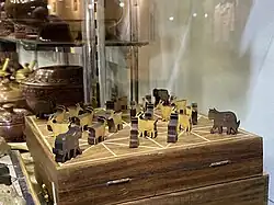 Bagh-chal (Nepali: बाघ चाल bāgh cāl, Newar: धुँ कासा dhun kasa meaning "tiger game")[1] is a strategic, two-player board game that originated in Nepal. The game is asymmetric in that one player controls four tigers and the other player controls up to twenty goats. The tigers 'hunt' the goats while the goats attempt to block the tigers' movements. This game is also seen in southern India with a different board, but the rules are the same. This game is popular in rural areas of the country.[2]