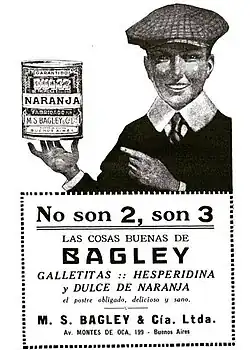 The company was established in Buenos Aires in 1864 by American entrepreneur Melville Sewell Bagley, when the company launched famous apéritif Hesperidina.[7] Bagley had been involved in the dry goods business in New Orleans before the outbreak of the American Civil War. After the outbreak he emigrated to Buenos Aires where he experimented with different formulas to create a digestive beverage using oranges as the main ingredient.[8] Hesperidina would be born from those tests.