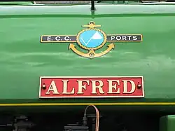 No longer required for traffic at Par harbour in 1977, Alfred was moved to the CSLPS site at Bugle in 1978, where a vacuum brake was fitted so that it could haul passenger trains. In 1987, the CSLPS had to move, and so Alfred found a new home on the Bodmin and Wenford Railway. About ten years later it was repainted in yellow livery, the colour used by the fictional Bill and Ben who were inspired by Judy and Alfred, but it has now been repainted back into a green Port of Par livery with the lettering as carried from 1969 to 1977.[4]