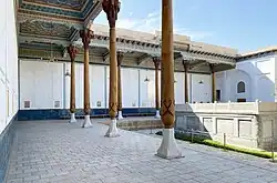 3. At the complex, there is a mosque called Khakim Kushbegi, with a flat trabeation, supported by two columns and forming six painted plafonds. To the south adjoins iwan with five columns and the same number of painted plafonds. To the north is another iwan, also with five wooden columns, a beam ceiling, and a vassa.