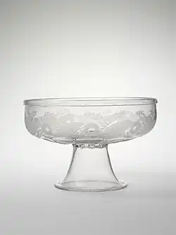Although the company produced practical glasswork for tables, lamps, and apothecary equipment, it was renowned for its pressed/engraved patterns, especially the pieces they made for prominent public figures or presidents.[6] Greyhounds were a popular Bakewell design along with other typical images like lovebirds.[2] Bakewell and company was rivaled by Boston & Sandwich and the Northeast Glass Co but gained fame by being the first American company to make pieces of entirely cut glass.[4] Cut glass is glass designed by a skilled hand and requires high-quality ingredients.[7] Bakewell and Company also gained fame because it began producing the first successful American glassware containing lead oxide, known as lead crystal.[6]