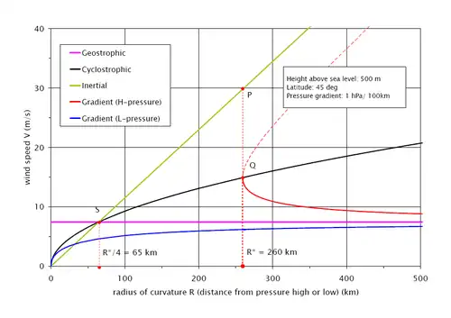 The balance-flow speeds also changes with the radius of curvature R of the trajectory/isobar. In case of circular isobars, like in schematic cyclones and anticyclones, the radius of curvature is also the distance from the pressure low and high respectively.