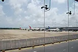 - Apron Alpha: It is the oldest existing apron at the airport. It has nine parking bays including five remote parking bays and four boarding bridge equipped bays. It can handle four Boeing 747 aircraft and five Airbus A330-200 aircraft at once.