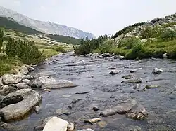 The river takes its source from the uppermost of the Banderishki Lakes, at an altitude of 2,310 m, situated in the Banderishki Cirque in northern Pirin. It initially flows to the northwest, catching the waters of the rest of lake group and the turns in northeastern direction. It flows at a high gradient of 100.77 m/km, which makes it turbulent, with many jumps and small waterfalls.[2] The highest waterfall is Banderishki Skok, reaching 11 m at an altitude of 1,700 m. Its surroundings were declared a protected area in 1965. The Banderitsa then reaches the homonymous mountain refuge and in the next two kilometers runs through rocky and narrow valley. Upon reaching the meadow Banderishka Polyana on the foothills of the summit of Kutelo (2,908 m), the river disappears underground and reemerges after 1.5 km. At 400 m southwest of the town of Bansko at an altitude of 1,063 m, the Banderitsa merges with the river Demyanitsa, forming the river Glazne.[2]