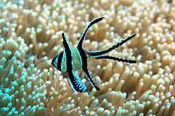 It is often found associated with the seagrass Enhalus acoroides and the long spined sea urchin Diadema setosum.[3] It occurs among various living benthic substrates such as sea urchins, sea anemones, and branching corals; young fish are most commonly associated with sea anemones, while juveniles and adults occur most frequently among long-spined sea urchins and branching corals, as well as sea stars, hydrozoans, and mangrove prop roots.[4] Individuals of 2 to 60 hover above the urchins, with the younger ones about 2 to 3 centimeters SL staying closest to them. The fish retreat among the spines when threatened.[3] Individual fish exhibit well-defined homing behaviour and return to the original location of their group when disturbed.[4] The Banggai cardinalfish often coexists with various anemonefish and anemone shrimp when sheltering in anemones and corals; when found among sea urchin spines, it associates with several other genera of cardinalfish. Following removal of the fish by aquarium collectors, the abundance of associated invertebrates has been shown to decline.[4]