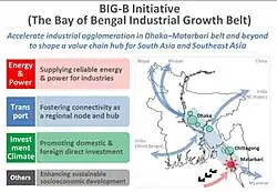 The Bay of Bengal Industrial Growth Belt Big B is a dream of the late Japanese Prime Minister Shinzo Abe which is a long-term plan to strengthen the existing partnership between Bangladesh and Japan. This plan came to the mind of Prime Minister Shinzo Abe around Matarbari. During Prime Minister Shinzo Abe's visit to Dhaka in 2014 initial talks with Bangladesh Prime Minister Sheikh Hasina and Bangladesh and Japan agreed to implement this plan.[7]