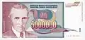 5,000,000 dinara | 163 × 78 | Green and dark red | Nikola Tesla | Tesla coil and Iron Gate II Hydroelectric Power Station | 26 May 1993 | 1 December 1993 | ||
