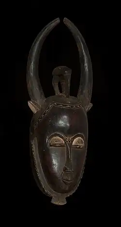 The Baoulé people have a wide array of artistic creations that play a major role in indigenous spirituality. There lies an onto-epistemological difference in the Western consumption of Baoulé art, and the indigenous application of their creations.[2] As opposed to the Western focus of the physical stylization and technique of art, Baoulé people view their creation's significance through the lenses of linking the spiritual realm with the physical human world.[2] Within the realm of the Baoulé art style, Western interpretation assigns a presence of a centered being being emitted from the representational art. The gestures and expressions assists the interpreted feeling with depictions of inward or collected statures.[2] Their sculptures are renowned for their refinement, form diversity and the labor they represent. The sculptures do not only include face masks and human figurines, but also include a great variety of work in gold,[3] bronze,[3] wood, and ivory. Among the pieces, there will be a prevalence of the colors red and black; red being associated with women, and black being associated with men.[4] Masks amongst the Baoulé people correspond to several types of dances: the goli glin, the kple kple, the gbagba (also known as mblo), and the bo nu amuin.[4][5][6] Sculptures amongst the Baoulé people also include, but are not limited to: blolo bla, blolo bian, and bo usu.[7]