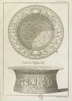 The same author recognizes many Western characters; he believes that the four horsemen present in the medallions outside indicate the years of conflict between the sultans and the Franks. Milin also raises the possibility of an earlier arrival in France, linked to the Embassy of Harun al-Rashid to Charlemagne at the beginning of the 10th century. The work also presents rather imprecise engravings, but which show that the object has not undergone major modification since that time, with the exception of the addition of two plates to the arms of France in 1821,[2] a date in which the object is used to baptise the Duke of Bordeaux.[4]