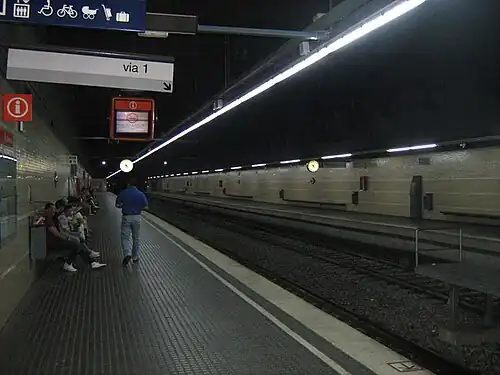 A total of 34 railway stations are situated along the line, all of which are disabled-accessible.[20] 19 out of 34 stations are underground, while the rest are at-grade,[15] and 6 out of 34 are transfer stations.[21] The opening of the extension of the Sabadell branch will suppose the incorporation of 5 new underground stations, one of which will be a transfer station to the Rodalies de Catalunya commuter and regional rail system.[19]