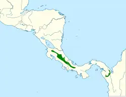 Its habitat is in mountain forests that are dense and humid, along with the edges of forests and in cloud forests that have an elevation of 3,000 to 7,600 feet. Sometimes, the elevation is almost 11,000 feet high. Although the owl can sometimes be found in thinner upland forests, it still requires a patchy forest. The owl's range is only in Costa Rica, Panama, and far northwestern Colombia. It can also be located in the Monteverde Biological Reserve and Volcán Poás National Park within Costa Rica.[5] The owl has been barely studied and its conservation status is unknown according to a 2017 book, but the IUCN Red List ranks it as least concern.[3][1]