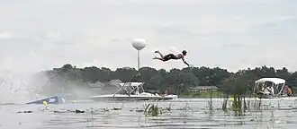 During this time barefooting began developing in Australia as well. In April 1963, the first national competition was held in Australia, with 38 competitors.[4] The Australians were the first to develop barefoot jumping, one of the three events in modern barefoot competition, as well as pioneer many new tricks. In November 1978, the first world championships were held in Canberra, Australia, where 54 skiers competed for a total of 10 different countries.[4] Australians Brett Wing and Colleen Wilkinson captured the men's and women's titles. In 1976 Briton Keith Donnelly set the first (officially recognized) World Barefoot Jump record of 13.25 meters.