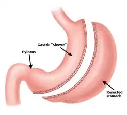 Sleeve gastrectomy, also known as a gastric sleeve, is a surgical weight-loss procedure where the stomach size is reduced by the surgical removal of a large portion of the stomach, following along the major curve of the stomach.[2] The open edges are then attached (typically with surgical staples, sutures, or both) to leave the stomach shaped more like a tube, or a sleeve, with a banana shape.[17]