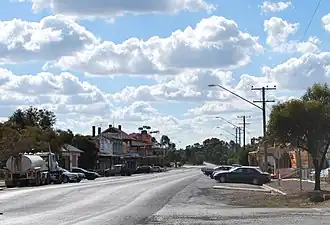 Barmedman is a rural village in the Bland Shire in the New South Wales state of Australia, located approximately half-way between West Wyalong and Temora. Barmedman began as a service centre for gold-mining operations in the area. Nowadays the local district has an agricultural economic base, including wheat and canola cropping and sheep grazing. It is the home of two large wheat silos with a combined capacity of over a million bushels. At the 2011 census, Barmedman had a population of 212.[2] The township's name is derived from an Aboriginal word meaning 'long water'.[3]