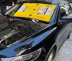 The Barnacle is a bright yellow, 20-pound (9.1 kg) piece of plastic that adheres to a windshield with 750 pounds-force (3,300 N) of force. It is equipped with an alarm that sounds if the vehicle is moved, and it has a keypad to input an unlock code so that the owner, after settling their parking violation, can release the device and drive away. It was introduced in 2016 by a company also named Barnacle, who envisioned drivers either delivering a deactivated Barnacle device to its owner or by using a ridesharing company to deliver it.[1] Parking officials in Allentown, Pennsylvania and Fort Lauderdale, Florida were early testers of the Barnacle devices.[2]