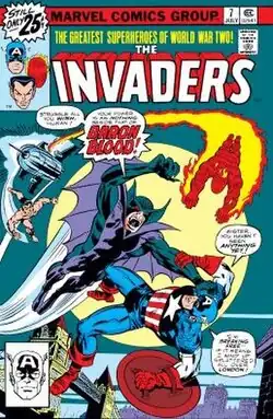 Roy Thomas and Frank Robbins featured the original Baron Blood, John Falsworth, in The Invaders #7-9 (July – October 1976); in the story flashbacks show him being turned into a vampire by Dracula on a trip to Transylvania and joining the German forces for World War I and World War II, while in the present day he stays at Falsworth Manor under the guise of his own son plotting to kill his niece, Jacqueline Falsworth, to get revenge against his elder brother, Lord Falsworth, until he is killed by Captain America.[2]