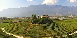 The three-storey château Villner Schlössl stands out in its prominent position on top of a cone-shaped vineyard in the Villa neighbourhood of Neumarkt. A vineyard surrounds the building in concentric circles, with the vines extending to the foot of the vineyard and beyond. The Villner Schlössl has gained in international recognition in recent years as it is used as a motif in international advertising campaigns for Alto Adige.