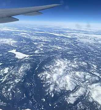 ![]() A view of the lake in April from a plane, it can be seen as a large white patch on the left side of the image | |