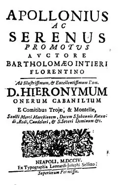 - Intieri, Bartolomeo (1704). Apollonius ac Serenus promotus (in Latin). Neapoli: ex typographia Leonardi Josephi Sellito.