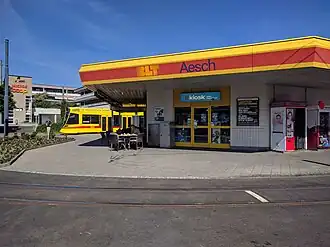Trambahn Basel-Aesch opened a line between Ruchfeld, in Basel, and Aesch, on 7 December 1907. Trains continued over the Basel tram network and terminated at Aeschenplatz.[2] The line was electrified from opening at 550 V DC, later increased to 600 V DC.[3] In 1974, Trambahn Basel-Aesch merged with three other companies to form Baselland Transport, which continues to own and operate the line.[4]