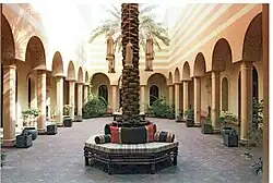 "Inspired by the ruins of ad-Dariyya (Diriyah) the architect Basil Al-Bayati in his design for the new cultural centre incorporated some of the ancient architectural features. There are the mud-faced walls with square and circular buttresses invoking the old fortifications as well as ornamental triangular perforations arranged in rows in imitation of those on the walls of the ancient buildings; doorways, too, have recessed upper portions in the traditional manner. In this way the style of the new building reinforces the connection with the ruins of the old capital."[4]