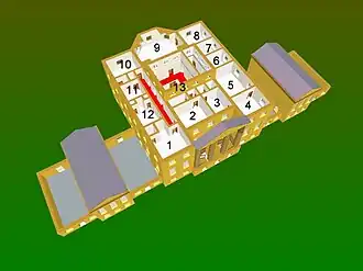 The first floor. 1: The four service courts; 2: Portico and West front; 3: North Pavilion; 4: South Pavilion; 5: Entrance Hall; 6: Staircase Hall; 7: Octagon Drawing Room; 8: Dining Room; 9: Study; 10: Library; 11: Sutherland Room (formerly lady Iliffe's sitting room); 12: Kitchen (since 1952); 13: larder (?); 14: Green Drawing Room (formerly Breakfast or Small Dining Room).